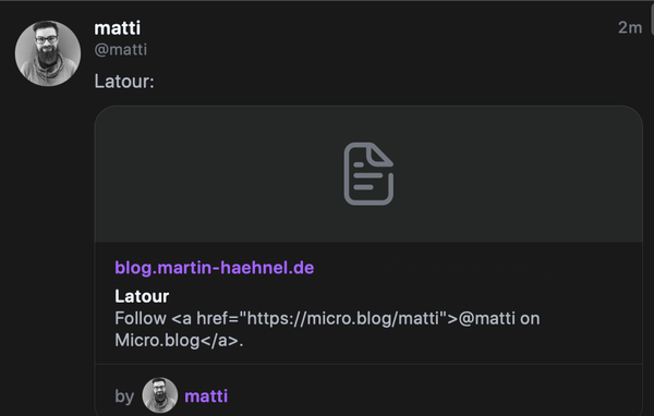 .@manton Is there a way to control what's in the "description"(?) of a blog post shared to mastodon? I mean that "Follow on micro blog" part.